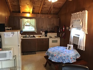 Hide Away Haven's third cabin; The Den. This is a photo of the kitchen and livingroom.