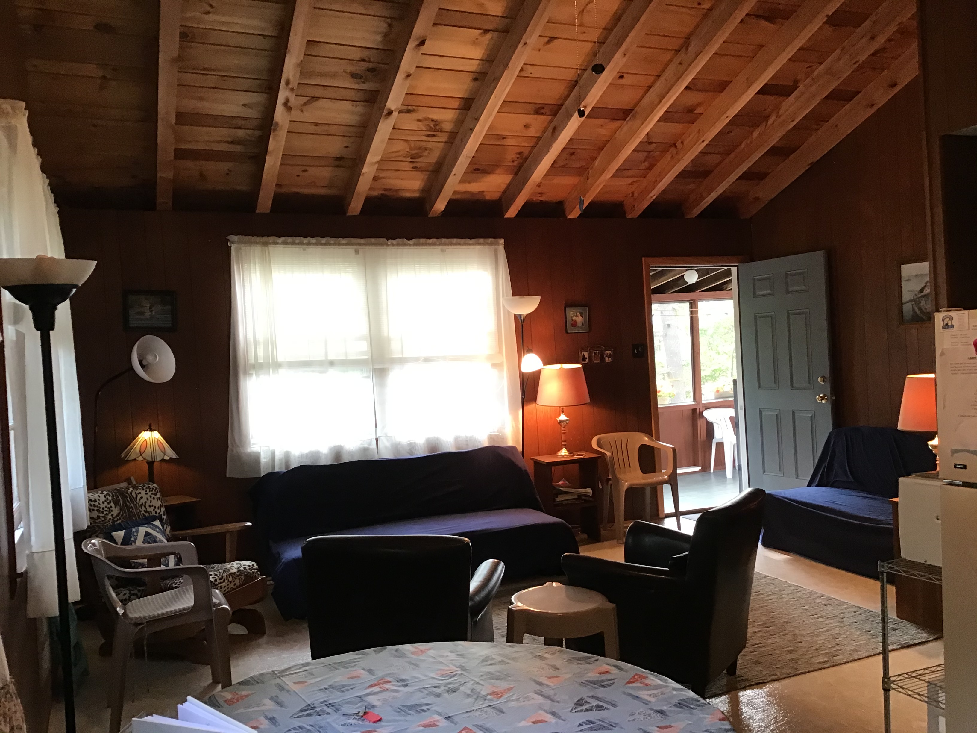 Hide Away Haven's third cabin is a ranch style named The Den. This is one of four quaint cabins situated on the property. This cabin is equipped with a full kitchen, full bathroom, living room, master bedroom, and bunk room. This cabin also has a screened in porch great for dinning al dante!